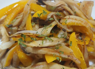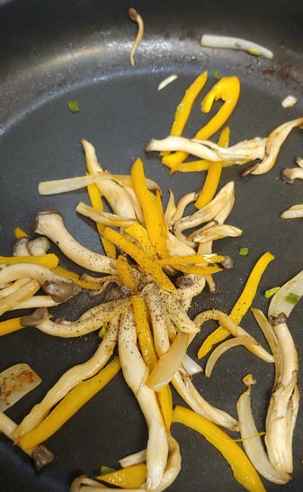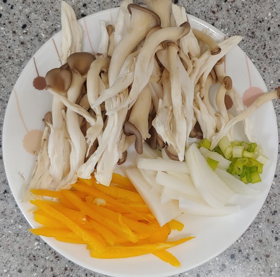 재료 : 느타리 버섯 반팩 분량, 꼬마 파프리카, 양파, 파, 소금, 혼다시, 후추, 카놀라유